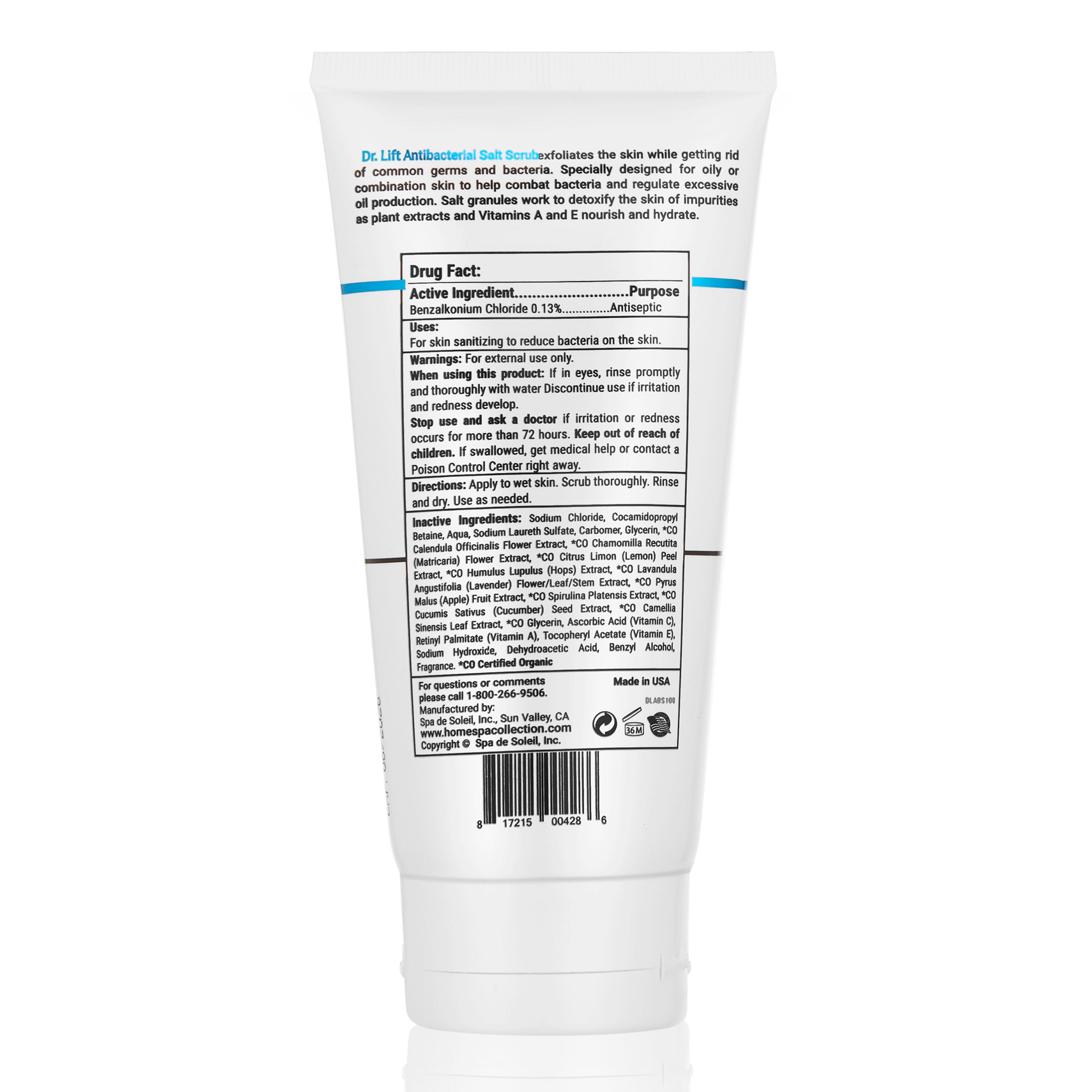 Dr. Lift Antibacterial Salt Scrub exfoliates the skin while getting rid of common germs and bacteria. Specially designed for oily or combination skin to help combat bacteria and regulate excessive oil production. Salt granules work to detoxify the skin of impurities as plant extracts and Vitamins A and E nourish and hydrate.