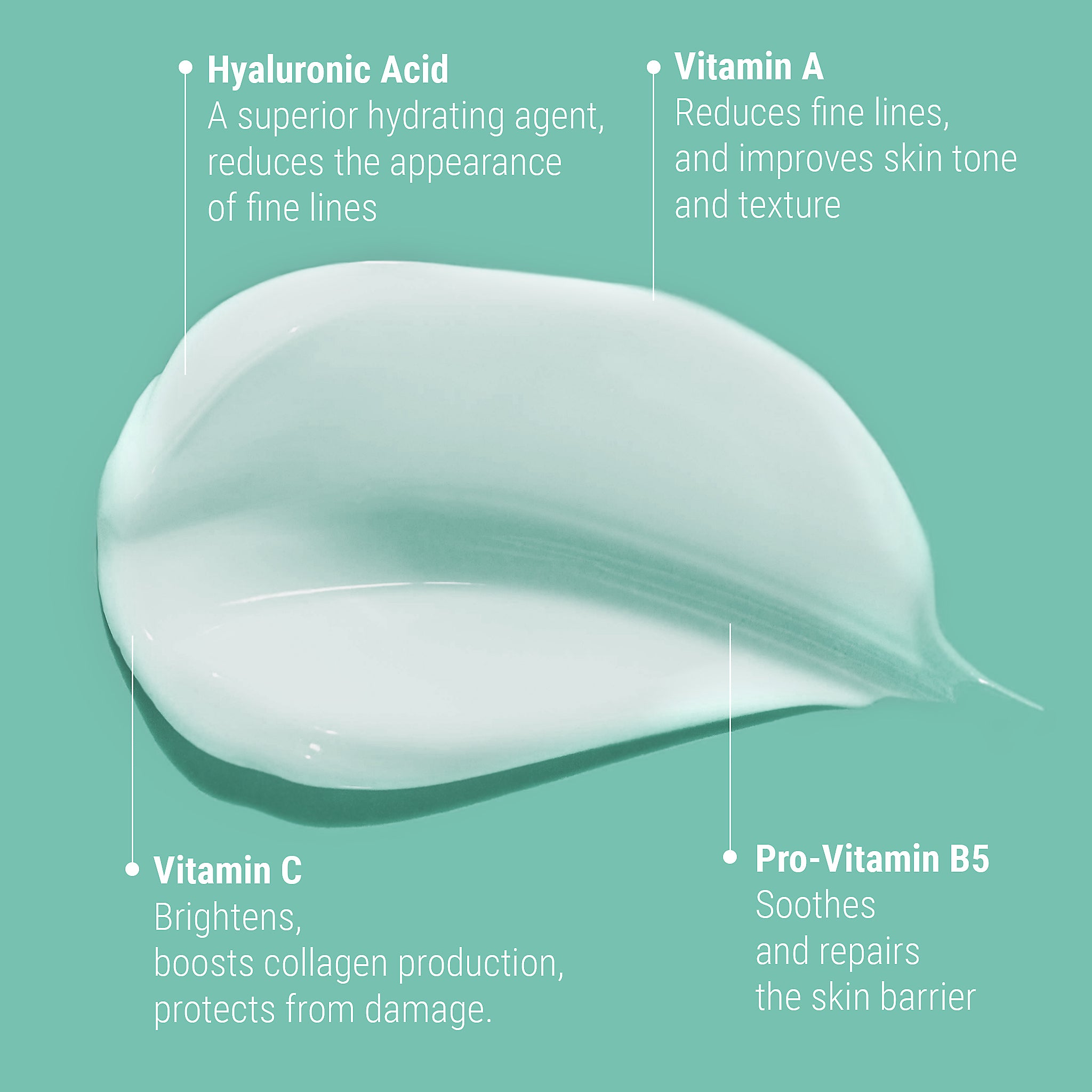 Ingredients: Aqua, Caprylic/Capric Triglyceride, Glycerin, Sorbitol, PEG-100 Stearate, Glyceryl Stearate, Cyclopentasiloxane, Glycol Stearate, Stearic Acid, Sodium Hyaluronate (Hyaluronic Acid), Sodium PCA, Panthenol, Phospholipids, Tocopheryl Acetate (Vitamin E), Ascorbic Acid (Vitamin C), Linoleic Acid, *CO Glycerin, *CO Prunus Armeniaca (Apricot) Fruit Extract, *CO Rosa Centifolia Flower Extract, *CO Rosmarinus Officinalis (Rosemary) Leaf Extract, *CO Aesculus Hippocastanum (Horse Chestnut) Seed Extract, Sodium Hydroxide, Carbomer, Retinyl Palmitate (Vitamin A), Disodium EDTA, Phenoxyethanol, Ethylhexylglycerin, Fragrance.